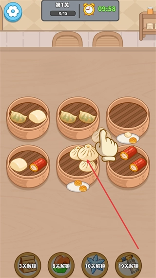 2、根据指引,将对应的点心移动到同一蒸笼内,完成三个同类点心的归置,以此推进关卡进度,逐步完成打包任务。