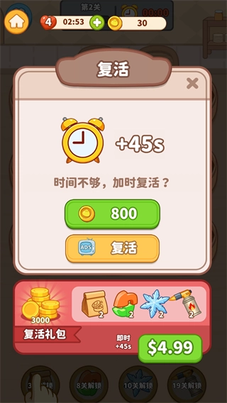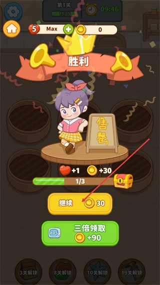 4、关卡完成后出现胜利界面,点击继续按钮,可领取30金币的奖励并进入下一关,也可选择三倍领取获取更多金币。