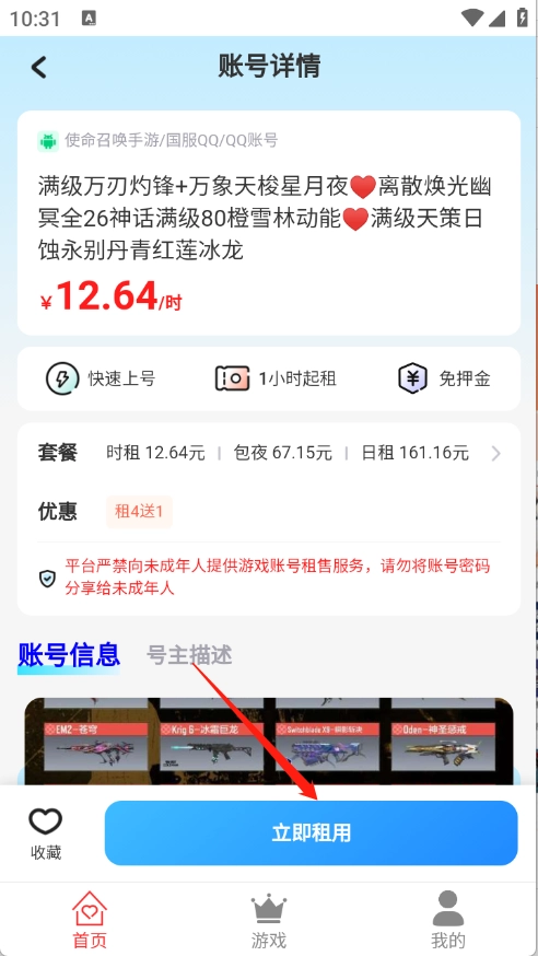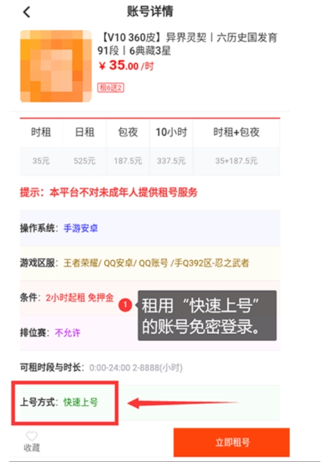 5、点开需要的账号进入详情页,点击“立即租用”。