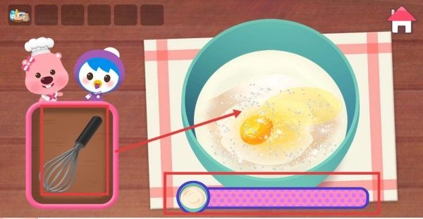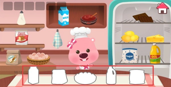 2、在厨房场景中,找到对应食材(如面粉、鸡蛋、牛奶等),按提示将其拖动到操作区域。