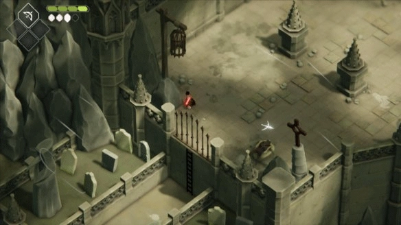 向前走来到墓园,击败路上的敌人爬上梯子;