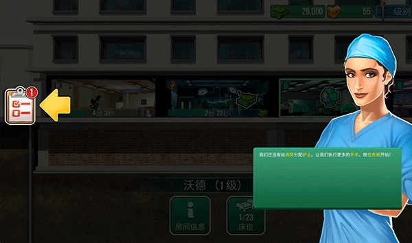 医院主体建成后,还需规划病房区域供患者入住。后续可通过商店入口进入,访问病房及其他科室的建设界面,点击对应建设按钮即可启动施工流程;待病房位置的绿色确认标识亮起时,点击该标识即可完成病房的最终建设。