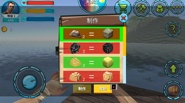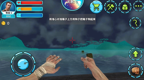游戏界面的左上方会显示当前玩家的生命值、饥饿度与水分值,点击右侧的钩子图标就能触发钩索,从海面抓取可用物资,同时游戏内还存在昼夜交替的时间系统。