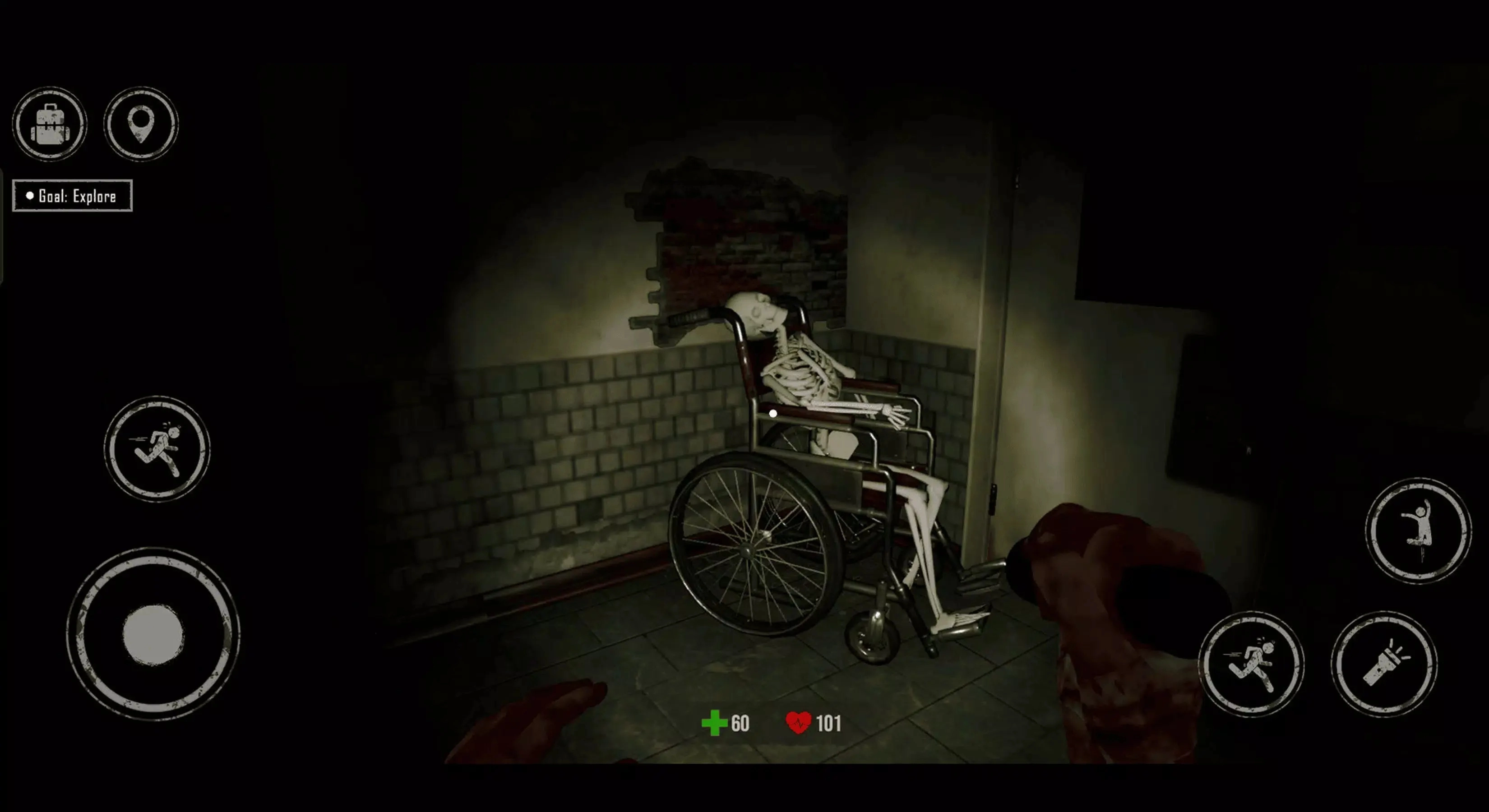 右侧设有奔跑、跳跃与手电筒按键,其右上方则排列着背包和定位按键。