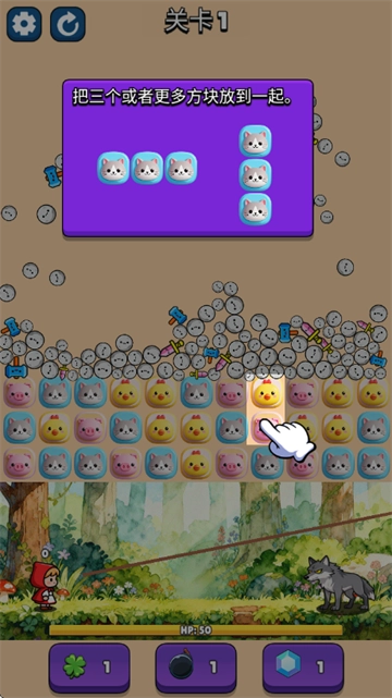 这是一个结合了三消与物理机制的玩法:通过消除方块让石头下落,这些石头会化作小红帽的武器,随后小红帽就能用这些掉落的武器攻击恶狼。关键在于规划好消除的路径,借助重力让石头成功落下并转化为武器,这才是核心目标,而各类道具也能为你提供助力。