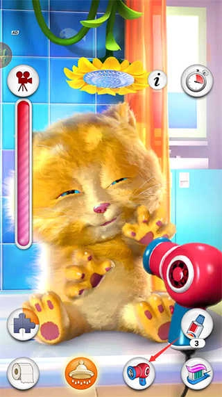 例如洗澡,点击金杰猫头上的淋浴器就会喷水;