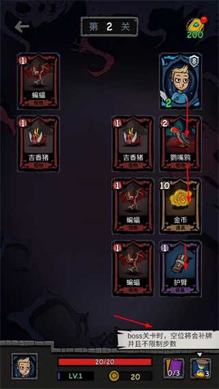 在BOSS关卡里,借助空位移补牌的机制,通过合理搭配卡牌来对付敌人,并且收集金币、护臂之类的资源。