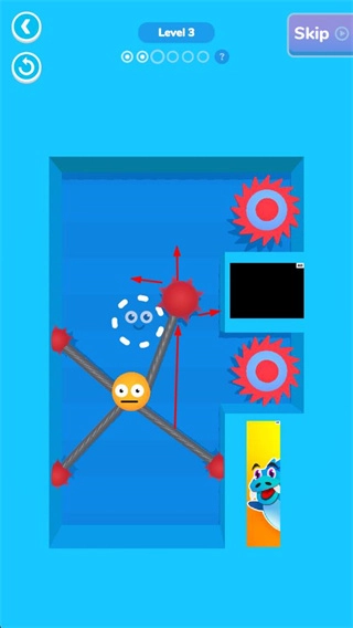 在Level3关卡里,你需要操控绳索人偶伸展肢体,躲开齿轮机关,把红色球体推到目标区域。
