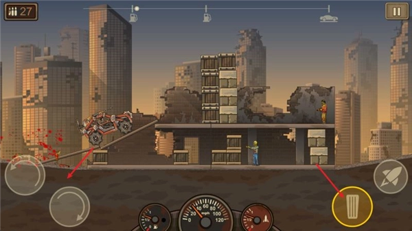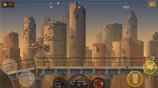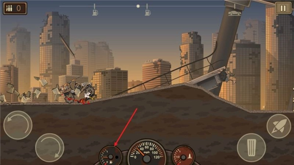 进入游戏后,左边的两个按钮分别用来控制车辆压头和抬头,右边的是油门按钮,点击火箭按钮就能使用推进器。