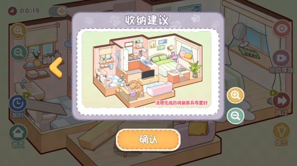 以“搬家日记”关卡为例,玩家能够借助游戏里提供的各类道具对房间进行布置。
