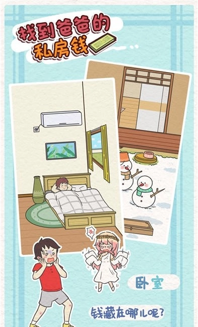 找到爸爸的私房钱是一款休闲解谜游戏,游戏以细腻的场景刻画呈现家庭生活中的点滴细节,每个房间都藏着不为人知的小秘密。从客厅沙发的缝隙到书房字典的内页,都有可能成为私房钱的藏匿之处,随着游戏进度的推进,还会出现更多充满创意的隐藏地点。玩家需要结合道具的使用与环境的互动来解开谜题,整个过程中充满了意外的发现和欢乐的时刻。