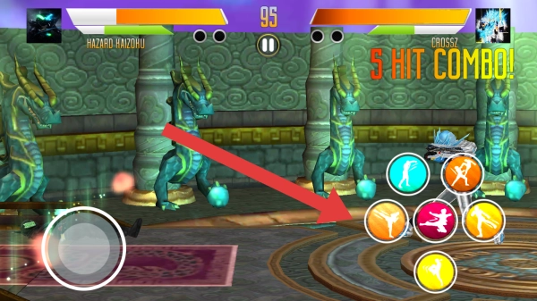 屏幕上显示着95的血量数值,5HITCOMBO!的5连击提示,搭配清晰的技能按键标识,再加上背景里醒目的龙形装饰与充满特色的场景建筑,共同构建出一场紧张刺激的格斗对战画面。
