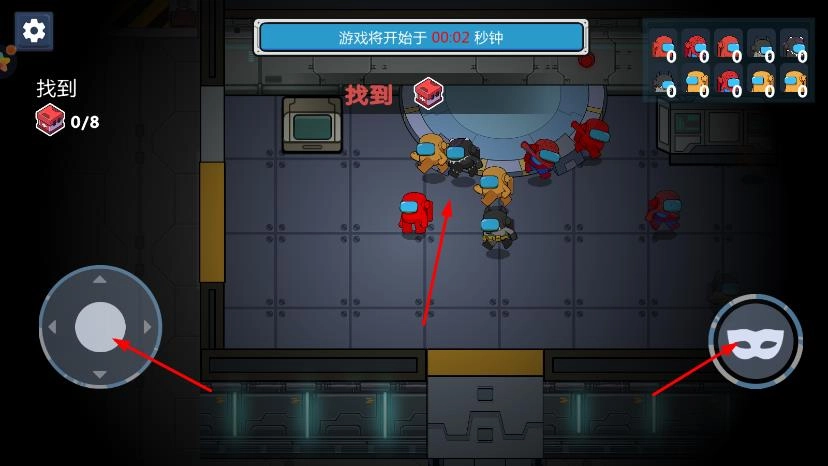 可以用左边的摇杆操控红色角色的移动方向,右边那个面具样式的按钮或许是用来让角色隐藏,或者触发特殊技能的。你需要在整个场景里仔细搜寻像红色箱子这类目标物。