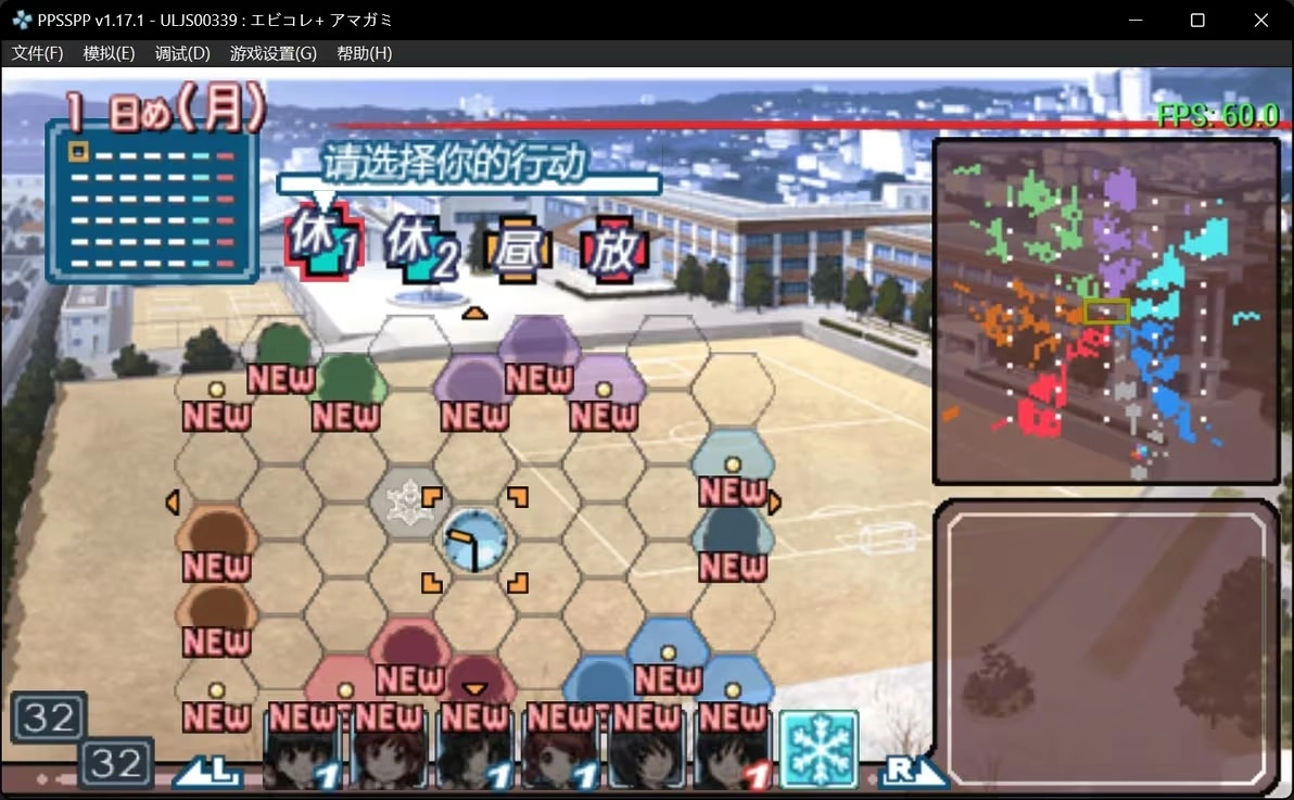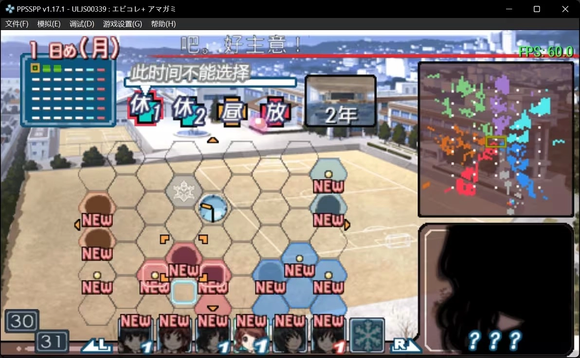 首先在设置好名字、完成序章后,界面应该是这样的(序章的三个选项不影响结果,任选其一都可以)。当然,如果你是初次游玩,界面上原本不会有这些颜色方块——这些颜色对应着不同女主角的事件,而右上角的地图则会显示当前的进度情况。