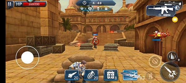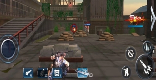3、进入游戏后,可通过拖动屏幕瞄准敌人,点击右下角的开火键,角色便会移动出障碍物并进行射击。