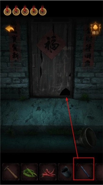 7、利用【长柄雨伞】从门右下角的孔洞里取出【小木块】。