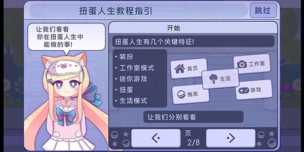 1、在扭蛋人生模拟器里,你可以尽情打扮、创建场景、玩小游戏、去探险,还能体验扭蛋的乐趣!这份教程会助力你开启这段奇妙旅程!点击箭头按钮就能进行导航。