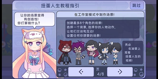 4、在工作室模式里打造场景吧!可以创建最多包含8个角色的场景哦!挑选一个背景,选定角色的动作,让他们进行对话与互动!搭建出你想要的任意场景!一定要去看看扭蛋人生的视频呀!