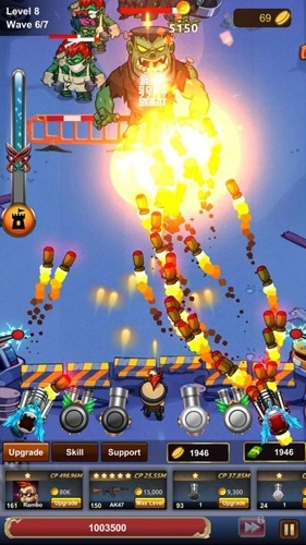 2、第一种策略是优先升级主炮的攻击力,以便能以最快速度消灭各类丧尸,从而快速获取资源。这一玩法比较考验玩家的手速和手机的性能,虽然也需要投入时间,但核心还是在于手速;另一种策略则是专注积累资源,用来升级各类可以自动攻击的副炮。