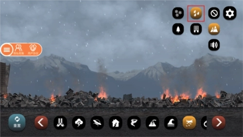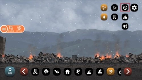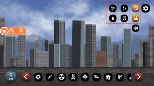 7、当城市被破坏得不成样子时,你还能通过下点雨或雪来稍微调节一下温度;要是想关闭天气效果,直接点击右侧带有斜杠的图标就行。