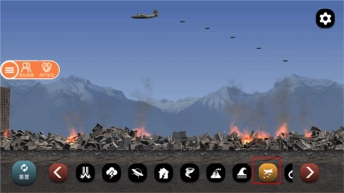 4、中间的多个功能按键对应着破坏城市的不同方式,比如那个类似雷达的图标,先点击这个按钮,再点击目标城市,就会有一颗陨石坠落下来,把该城市的所有建筑都彻底摧毁。