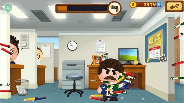 1、用各式各样的武器去殴打你的老板,刚开始的时候,仅能使用一些威力不大的铅笔和橡皮擦。