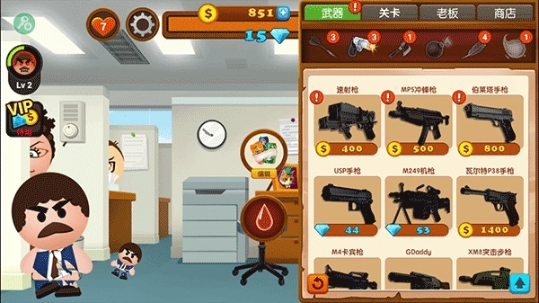 3、高级武器:《暴打老板4》拥有100+全新致命武器,绝对能让你的老板狼狈不堪。