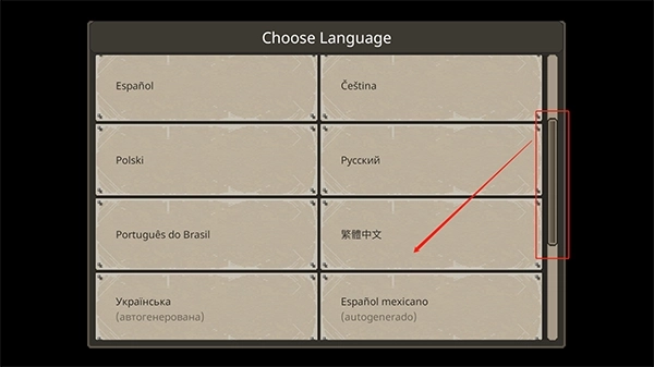 1、第一次进入游戏时,我们得手动挑选语言,往下滑动找到“繁体中文”的字样并点击,就能完成切换了;