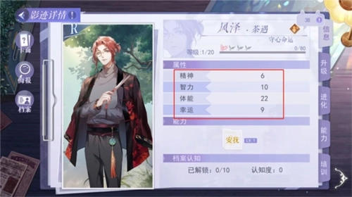 影迹的调查效果值由4个属性计算而来,每张影迹都具备【精神】【智力】【体力】【幸运】这4种属性,且不同影迹各有其属性偏向特点。在【影迹详情】里,升级、进化、档案、培训这几项功能,都是用于提升这四个属性的养成途径。
