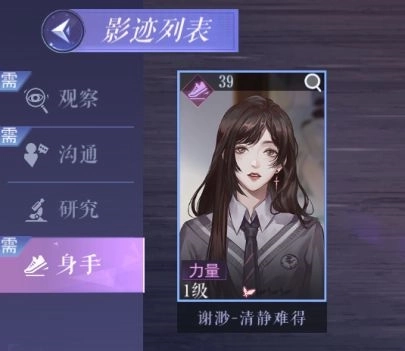 3、挑选和关卡能力要求相匹配的影迹。打个比方,像在现代篇引子-施工旧址这一关卡里,由于需要具备【身手】能力的影迹,所以要从身手分类里选择[谢渺-清静难得]来完成通关。