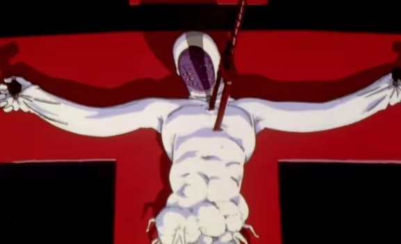 在Nerv本部最深处、最隐秘的空间里,矗立着一个巨大的十字架,上面钉着一尊白色巨人。它的面部被带有Seele标志的面具所遮盖,双手则被十字架上的巨钉穿透,牢牢地固定在那里。