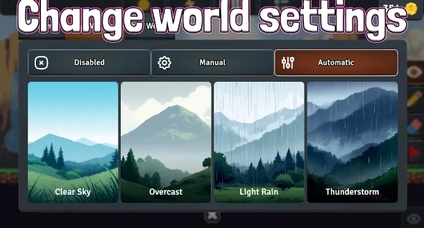 没有天气的话,世界会变得十分干燥。不妨在你的沙箱里加上云和雨,这样能让体验更丰富,还能感受到氛围的变化,把沙盒打造成一个鲜活、有呼吸感的杰作。无论是繁茂的森林、热闹的城市,还是多岩的山地沙漠,每个环境都是你发挥想象力的画布,这些主题能为你的沙盒增添独特的背景。