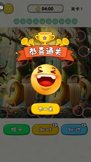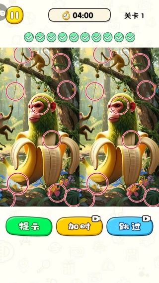 成功找出所有差异就能通关并解锁下一关;要是时间用完还没找齐,你可以选择重试或者用道具复活,继续进行挑战。