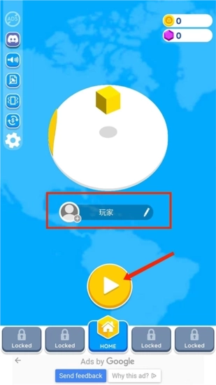 1、启动纸片大作战2游戏,进入【HOME】界面后,点击界面上的【笔】形图标就能修改玩家名称,而点击【三角形】图标则可以直接开始游戏。