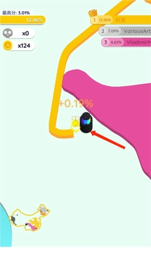 3、用手指拖动方块,让滑动的方块沿着现有地盘围出一个圈,等这个圈完全闭合后,它就会变成和你地盘相同的颜色,同时会出现【+0.46%】的提示,你的地盘也就随之扩大了。