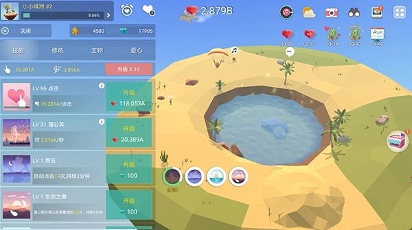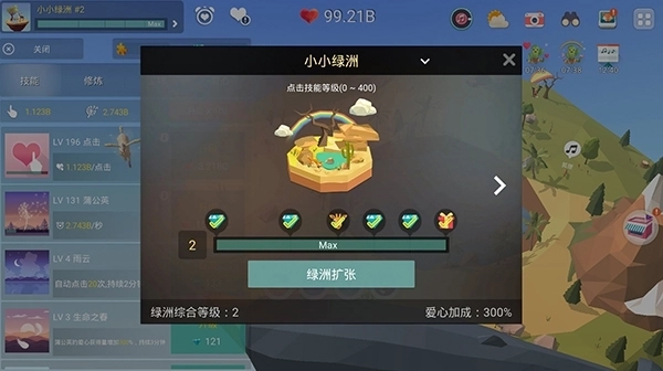 为了快速提升绿洲的小岛等级,升级我们的主要技能(点击技能)是非常重要的,建议大家前期可以主加。