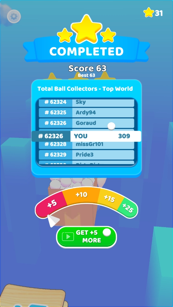 到达终点后,根据最终的小球数决定获得的星星。