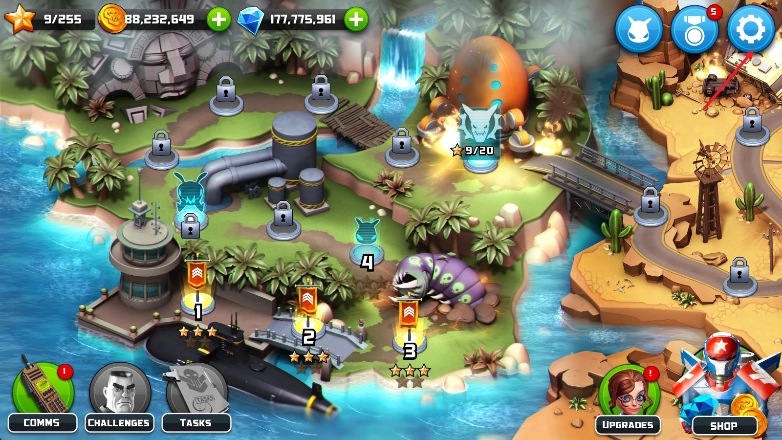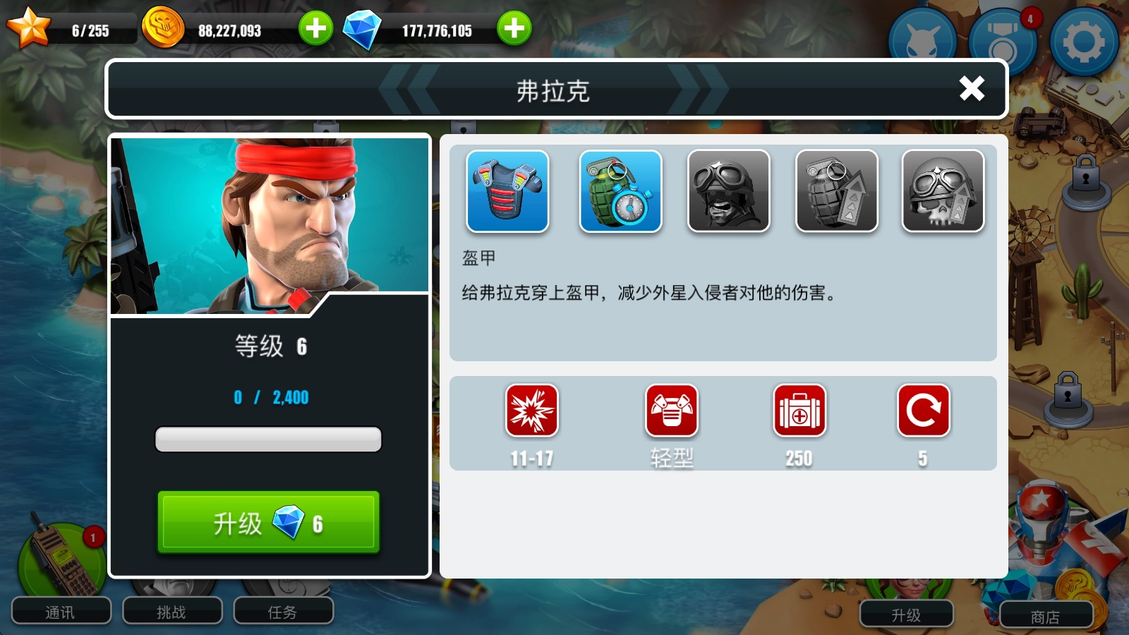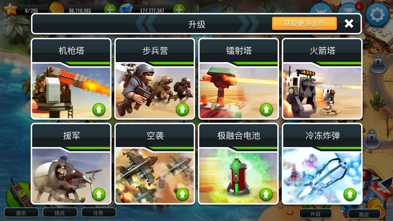 在主界面点击右下角的“升级”按钮,即可在此处挑选各类防御塔或支援道具来进行强化操作。