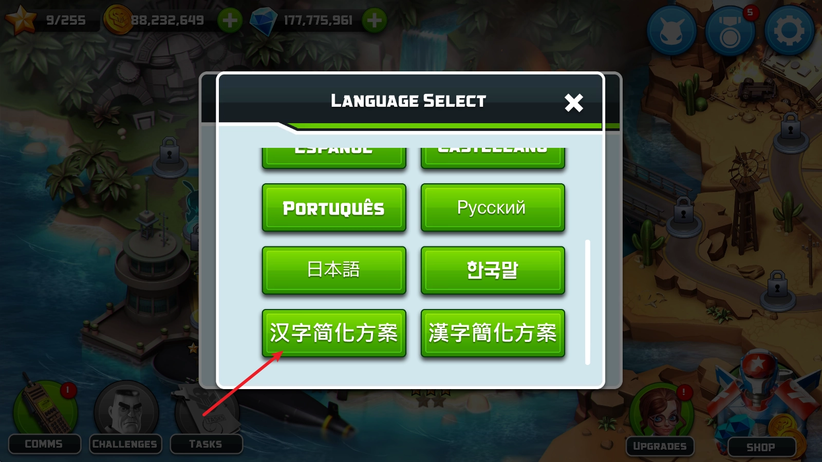 然后滑动到页面底部,找到“汉字”相关的选项,点击确认按钮后,重新启动游戏就能完成切换了。
