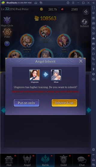 空闲天使具备一项继承机制:当阵容里用较弱的天使替换较强的天使时,较强天使的属性与升级效果会转移至较弱的天使身上。你也可以选择不启用继承功能,以此保留较弱天使原本的属性。