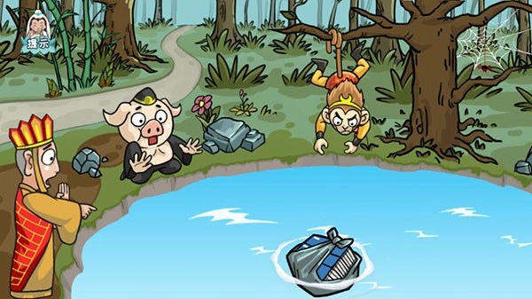 第三关,把场景里的蜘蛛网拖到竹竿上组合成鱼竿,把鱼竿递给唐僧,点击唐僧让他开始钓鱼,接着把八戒拖到唐僧身后,两人一起合力操作。
