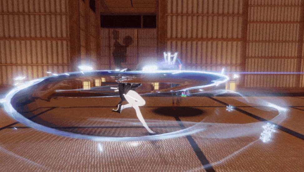 这段技能会对敌人施展横扫与挑击,造成冰属性伤害;其衍生技「镜花·漂冰」能召唤「日狭女」进行旋转斩击,此技能同样需消耗怒气,且需在「镜游」状态下才能释放。