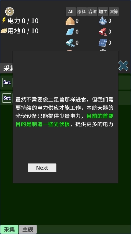 8、虽然不需要像二足兽那样进食,但我们需要持续的电力供应才能工作,本航天器的光伏设备只能提供少量电力,目前的首要目的是制造一些光伏板,提供更多的电力