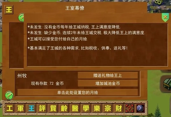在“王室幕僚”里,点击左上角的"?"号,可以可以查看影响当前王上满意度的各种因素。