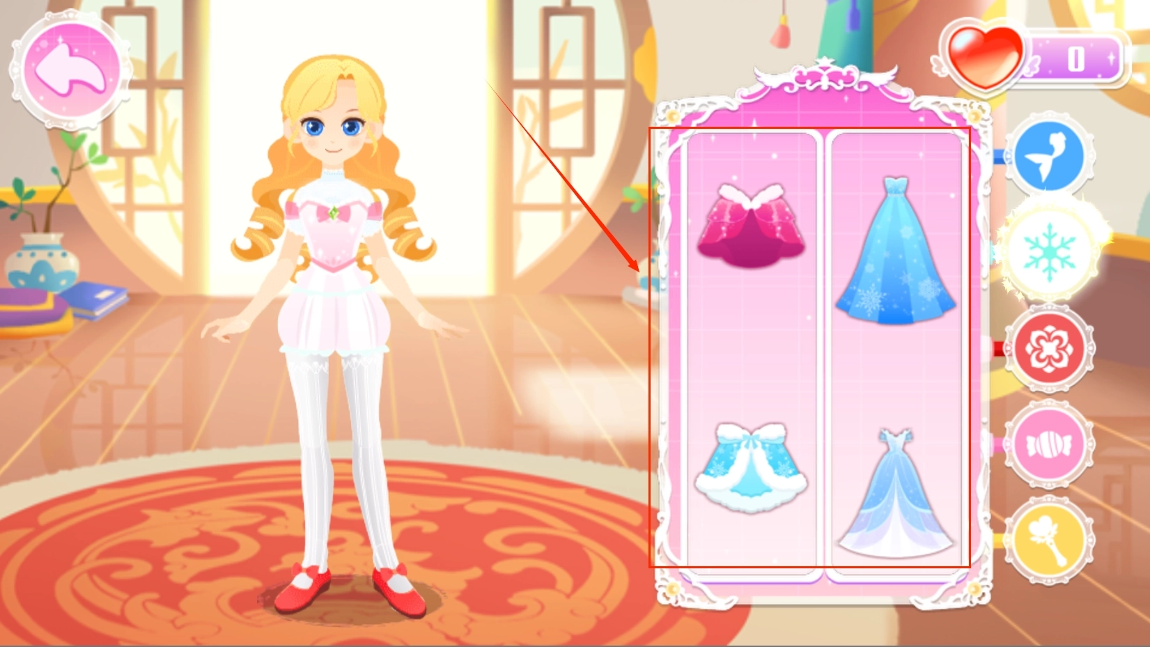 2、这里有不少有趣的玩法,点击衣柜能够为公主更换装扮,点击梳妆柜则可以帮公主化上美美的妆容。
