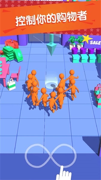 每个关卡里都有许多商品散落在地面上,你要操控小人不断召集人群,这样就能快速收集关卡内的所有商品。轻松愉快的背景音效能有效缓解压力,闲暇时玩这款游戏还能很好地打发时间。